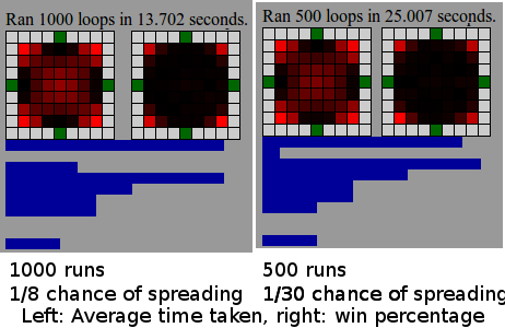 My simulator was well-received by /r/Minecraft, and I received some good feedback from people who knew more about the grass-spreading algorithms than is reasonable, and certianly more than I did. I tweaked the simulation accordingly, ironed out some bugs, and now I'm reasonably certain that it's an accurate simulation, and possibly even a useful tool for designing arenas for Phinq's game, providing information to ensure a reasonably balanced game. It could also be used by players to seek out the best spots, but where's the fun in that?